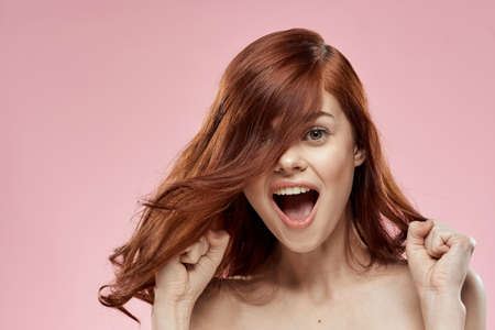 Pretty woman with long beautiful hair grooming hairstyle glamor naked shoulders pink background