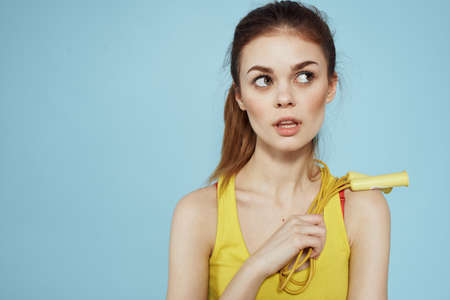 Sportive woman holding a skipping rope yellow tank top exercise gymnastics blue background