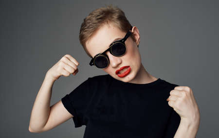 Woman with short hair and dark glasses makeup red lips glamor close-up