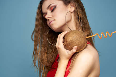 woman with coconut cocktail in hands wavy hair bright makeup lifestyle studio summer vacation