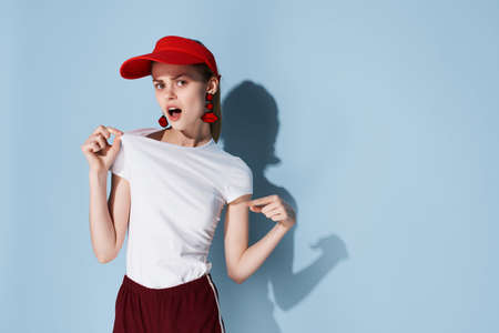 cheerful woman in a yellow t-shirt and blue cap posing emotions cropped view unaltered