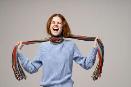 woman in yellow sweater fashion lifestyle cropped view blue background