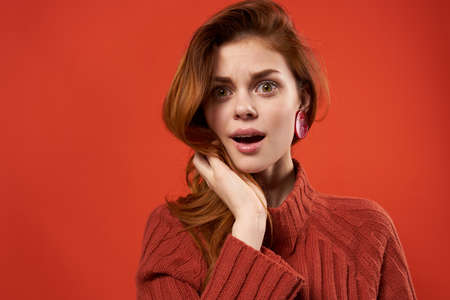 Portrait of ginger woman in red sweater in studio with isolated background.