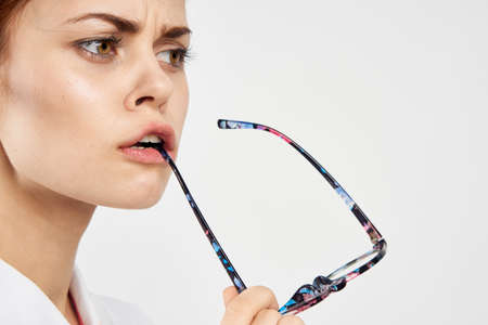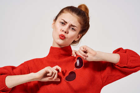 Cheerful fashionable woman clothes studio glasses lifestyle cropped