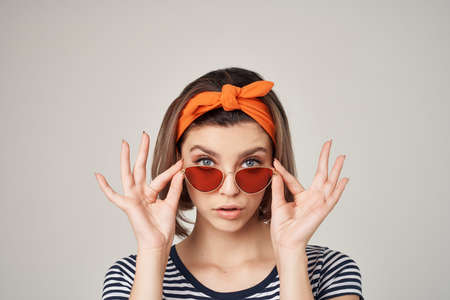 Cute girl sunglasses striped t-shirt lifestyle fun style pink background
