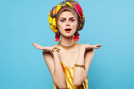 cheerful woman in multicolored turban attractive look Jewelry smile blue background