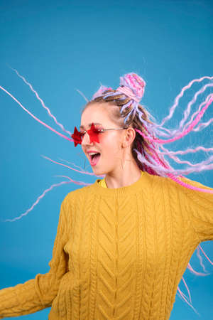 Portrait of a excited young beautiful woman with sunglasses holding to the hair. isolated blue background