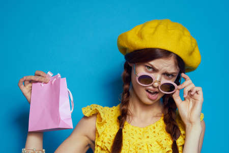 cheerful woman wearing sunglasses posing shopping fashion blue background