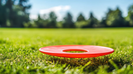 Bright red frisbee resting on lush green grass, surrounded by a picturesque outdoor setting, ideal for summer recreational activities and fun moments.