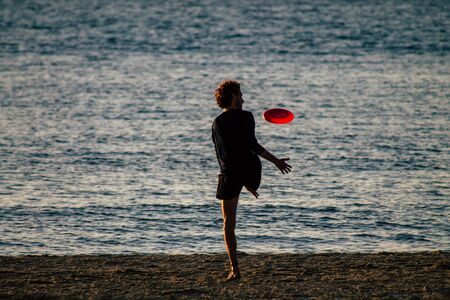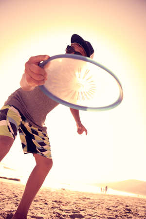 Attractive Teenager tossing a disc at the beach in Malibu California