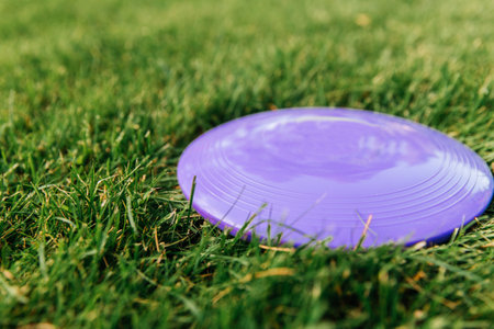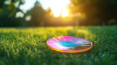 A colorful flying disc lies on lush green grass, illuminated by the soft glow of a vibrant sunset. This tranquil park scene captures the essence of outdoor leisure and fun.