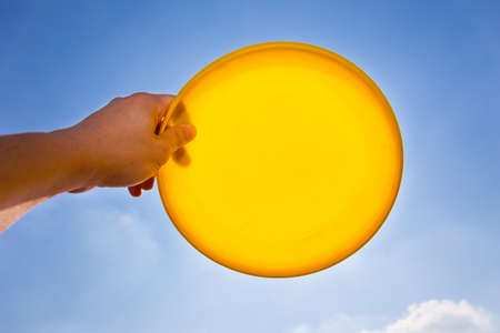 male hand catching, holding, yellow frisbee disc against blue sky background