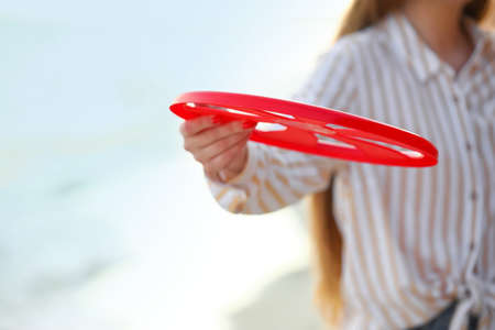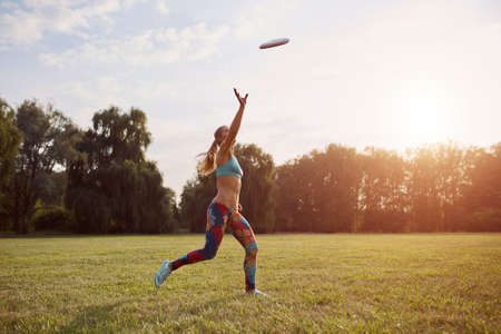Young athletic girl playing with flying disc in the park. Professional player. Sport concept