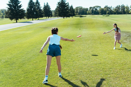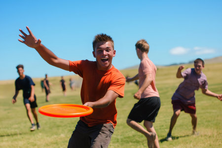 Teenager playing ultimate frisbee with friends, throwing orange disc during sunny day outdoor