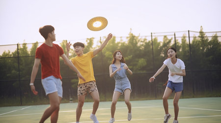 Catch the frisbee Group of young people in casual wear throwing plastic disk while spending carefree time outdoors : Generative AI