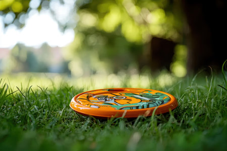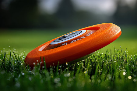 A vibrant orange frisbee lies on the green grass, glistening with morning dew. Kids can be seen playing nearby, enjoying a sunny afternoon in a spacious park setting.