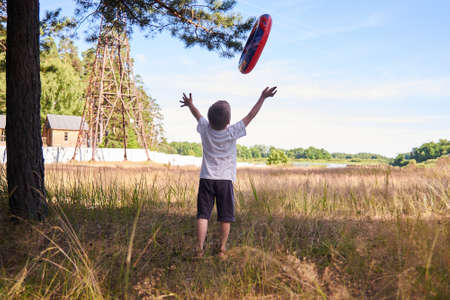 a boy plays in nature throwing an inflatable circle up. Concept of outdoor recreation with children. Healthy lifestyle