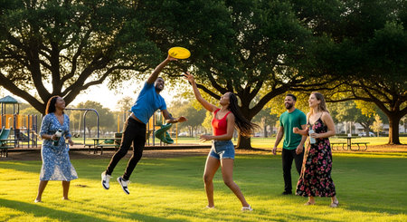 A group of friends enjoys a spirited game of frisbee in a park under the warm sun, laughing and having fun.