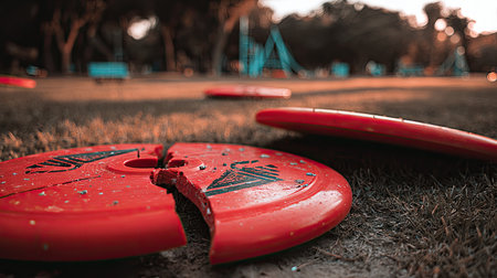 A broken red frisbee rests on green grass in a park, capturing a moment of loss amidst playful surroundings, with blurred playground equipment in the background.