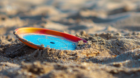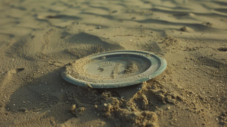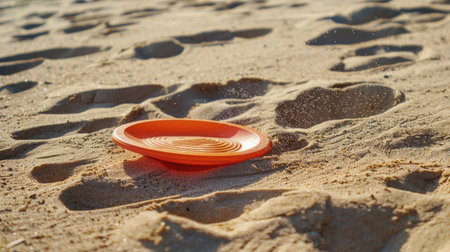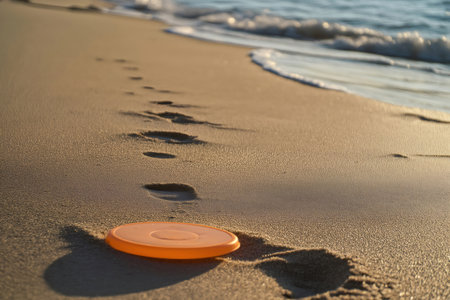 Orange frisbee resting on the sand, with footprints tracing a path towards the gentle sea waves, all illuminated by the warm sunset glow