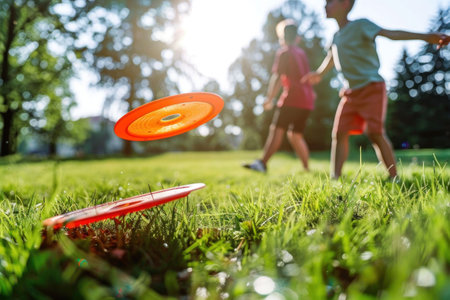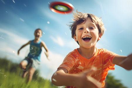 Two children playing frisbee in a sunny park setting with vibrant green grass and blurred background The scene conveys joy and outdoor fun
