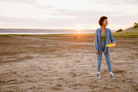 A young man stands on the sand, playing frisbee as the sun sets behind the hills, creating a serene atmosphere.