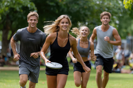 Four friends run energetically through a green park, playing frisbee and enjoying a bright, sunny day.