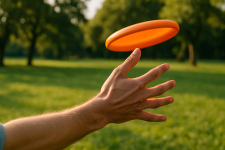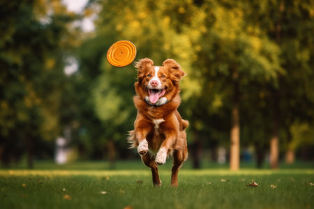 a frisbee flying mid-air towards a dog in a green park, created with generative ai