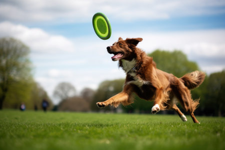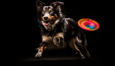dog successfully catching frisbee, tail wagging in excitement, created with generative ai