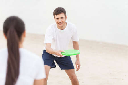 Man playing frisbee on lake shore. Girl playing frisbee on beach with man