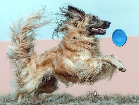Belgian Tervuren captured mid air while playfully catching blue frisbee. Its elegant fur flows dynamically showcasing its athleticism and focus.