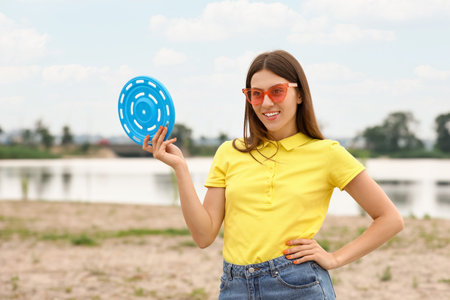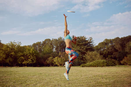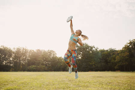 Young athletic girl playing with flying disc in the park. Professional player. Sport concept