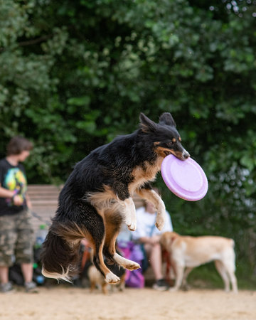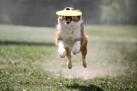 Sport with a dog. A dog jumps for a toy disc. Border Collie.