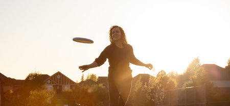 White Caucasian Adult Woman Playing Ultimate flying disc in the Green Field at neighborhood city park. Surrey, Vancouver, British Columbia, Canada.