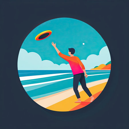 A person dressed in a colorful shirt stands on the sandy beach, throwing a frisbee into the air. The ocean waves crash gently on the shore while fluffy clouds float in a bright blue sky, creating a lively atmosphere for outdoor fun.