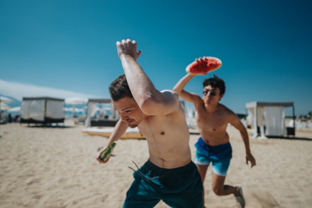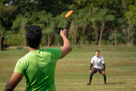 Catch the frisbee Group of young people in casual wear throwing plastic disk while spending carefree time outdoors : Generative AI