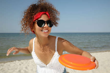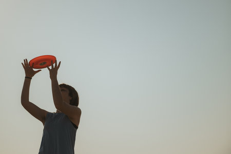 Happy African American woman catching flying disk against blue sky on sunny day, low angle view