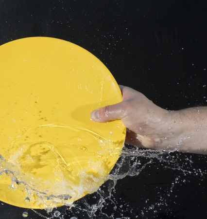Female hands holding pink vinyl record on yellow background. DJ, music concept