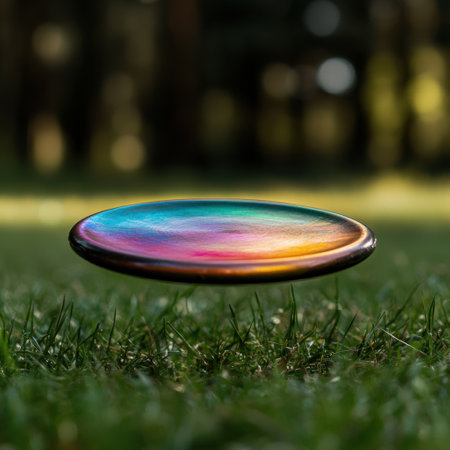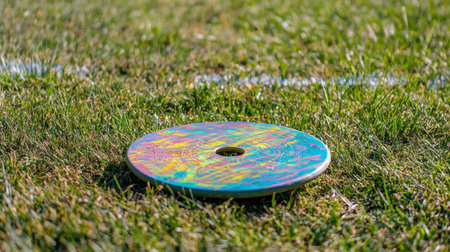 A dynamic display of colorful frisbees featuring unique designs set against a sleek city skyline. emphasizing innovation and modern style, this scene blend of vibrant sports gear with urban sophistication.