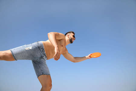 Happy man catching flying disk against blue sky on sunny day, low angle view