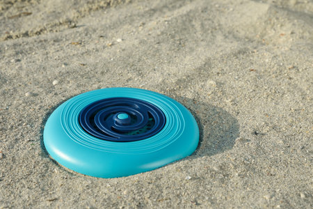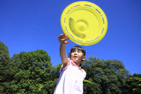 Little girl throwing disc in the park in summer on a sunny warm day during school holidays