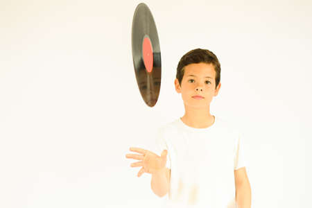 Guy with music helmets and vinyl in his hands. Concept of music, social networking photography