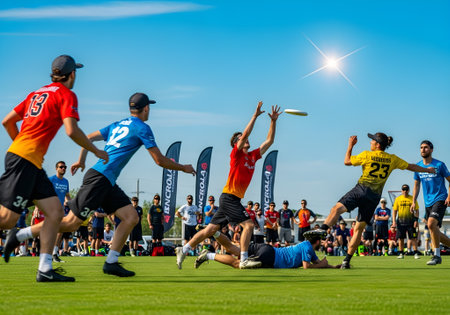 Athletes compete in a spirited ultimate frisbee match on a sunny day, showcasing athleticism and teamwork as they chase the disc under a clear blue sky