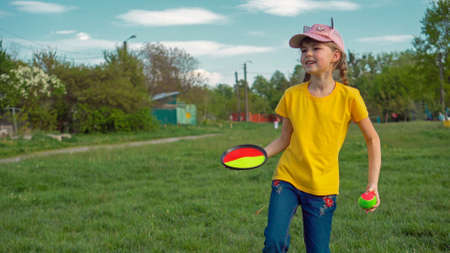 A young girl plays a tennis ball on Velcro outdoors. Day off, sunny summer day. Close-up