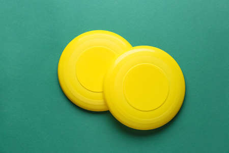 Green disc soars high in a clear blue sky with fluffy clouds on a bright day