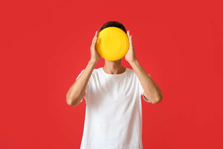 Cheerful outgoing handsome african-american young man with afro haircut, moustache, smiling amused catching red frisbee as playing outdoors, like active games, orange background