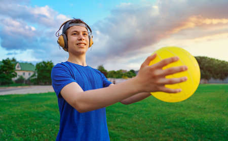 teen boy posing with ball at a stadium, he holds the ball in his hand, a soccer field with green grass - sports and health concept