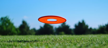 Frisbee in Flight Against Blue Sky and Green Grass for Outdoor Recreation Promo