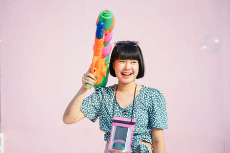 Beautiful short bob hairstyle woman enjoy Songkran water festival in Thailand with water gun. Cheerful and happiness. Modern songkran. Isolated on pink background. Songkran in Bangkok.
