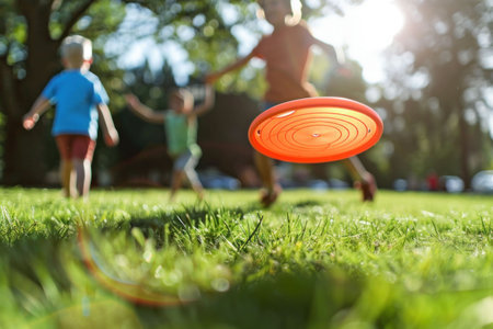 Children playing frisbee in a sunny park setting with vibrant green grass and sunlight filtering through trees